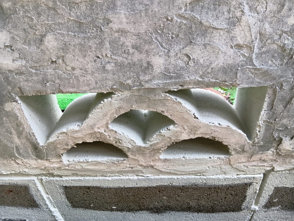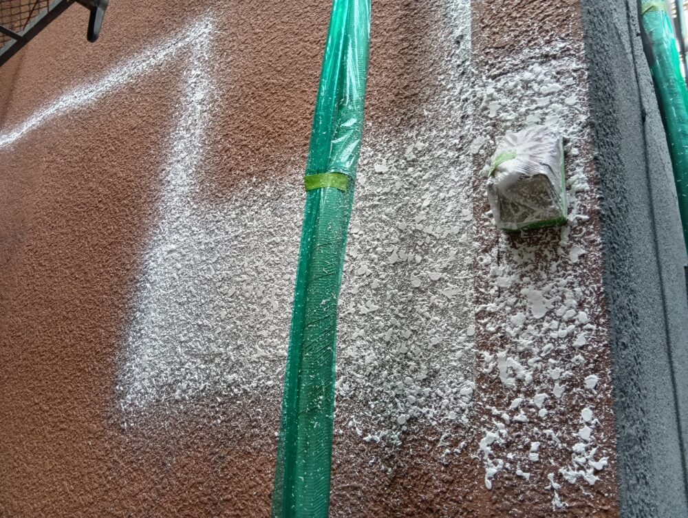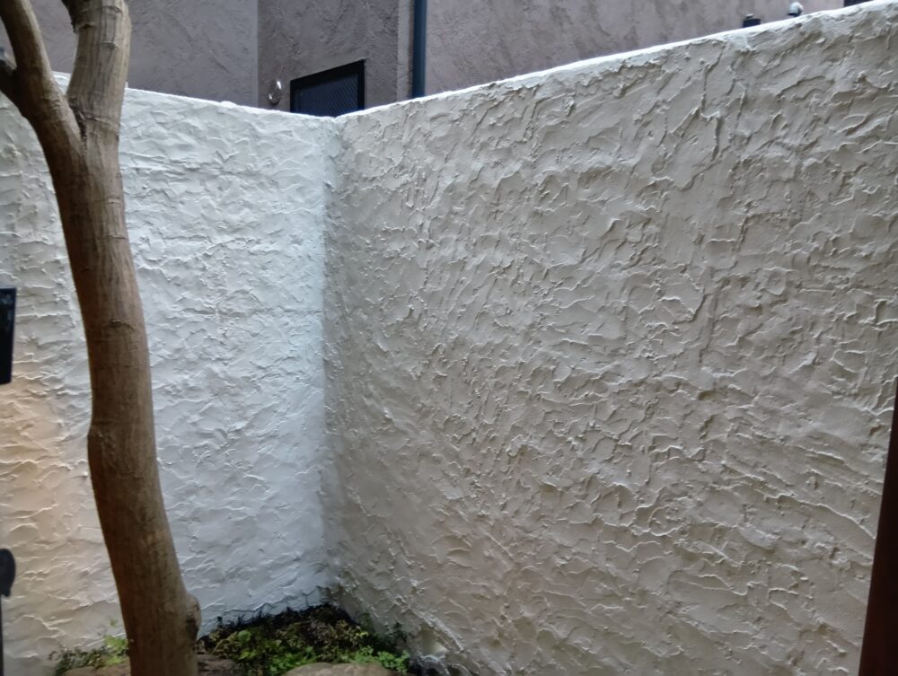 劣化が進行しており、ところどころ壁が浮いて剥がれてしまったり、昔つけていたケーブルの跡が残っていました。既存壁に近しいパターンをつけてから、塗装を行い、剥がれが目立たないように補修を行いました。