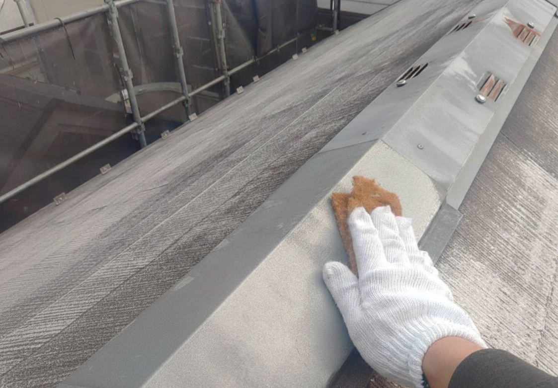 隣家との隙間が極小で人ひとりがぎりぎり入れる隙間でしたが、なんとか作業することができました。ケレンをしてから塗装を行います。